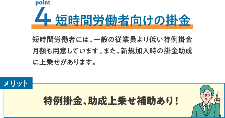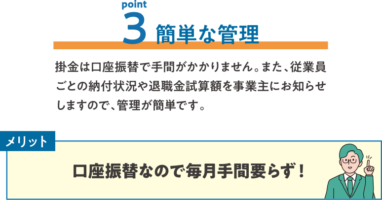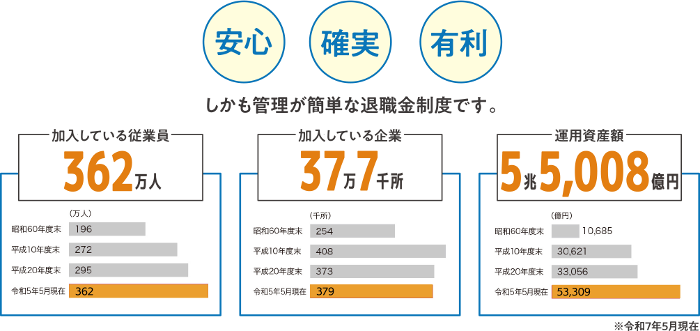 - 小規模な事業所でも安心して退職金を準備できるからです。退職金制度が整っていない企業も多い中で、中退共なら制度がしっかりしていて、従業員が安心して働ける環境を整えることができます。